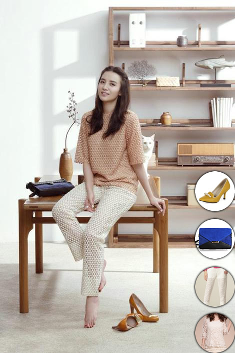 宋佳,裸粉色镂空钩花针织T恤+白色镂空休闲裤+姜黄色高跟鞋+蓝色拼接斜跨手拿包