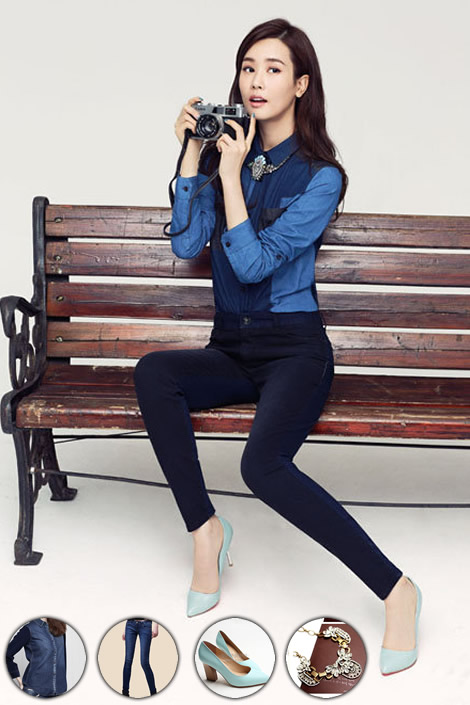 李多海秋装写真,拼色衬衫搭配牛仔小脚裤,立显苗条好身材,薄荷绿高跟鞋小清新了一把,值得借鉴哦!