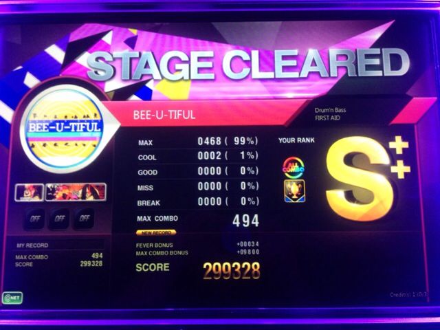 我记得开始的时候Bee这首歌我都是砸过去 能砸过S都是万幸了ˊ_>ˋ 后来看了一下铺面 看明白了~手感好了就能1Break 没想到昨天手感极好 居然全连了( ̄▽ ̄)好开心。 还把Sin Hd P掉了~Now A new day 1Break有些可惜了~好Sad