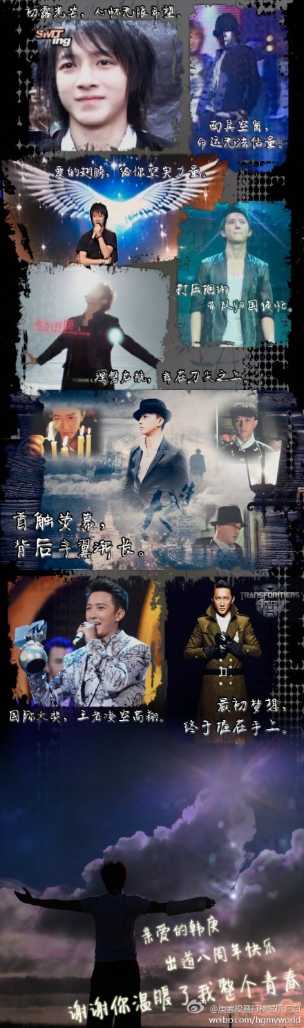 韩庚在韩国的演艺之路并不平坦,他进入了Super junior-M成为了里面唯一一个中国队员,因为韩国的某项相关法律,韩庚上台表演需要戴面具,而且限制了他拍广告,同样也不能演电影。这让怀揣了“当演员”梦想的韩庚顿时信心全无,既然不能当演员,那就安安分分做一个好的舞者吧,可是十三个人,唯独他要戴着面具在台上表演,这对于一个大男孩来说,是多伤自尊的一件事?但坚强又倔强的韩庚依然没有选择放弃,跳舞是他的梦想,只要能跳舞,这又算得了什么?我不能忘记他说得这么一句话:“韩庚在韩国要加油,要坚强,我爱大家,爱你们!”温暖干净又单纯的声音,洋溢着灿烂阳光的笑脸,像是在对自己说,却又确实是在对我们大家说。这让我想到了一句歌词:是铁打的肩膀,才扛得起光芒!