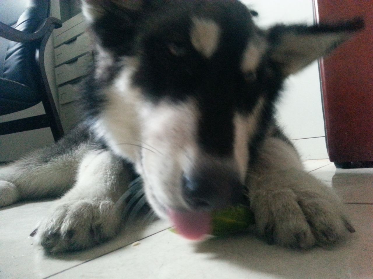 等它恢复精神之后我就把它弄回了单位,毕竟新房我还没住呢,而且听说阿拉斯加的破坏力极强,要是把我的家具毁了,我可就惨了。。。。。这是之后到了单位它发挥了破坏王的威力。。。。。。唉。。。。我的银子。。。。
