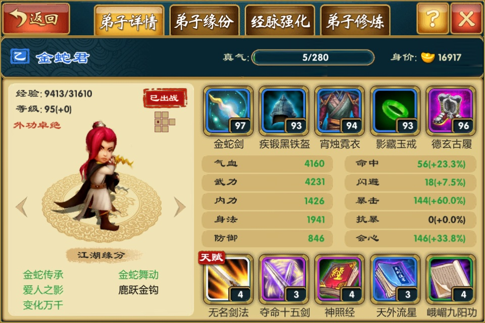 厉害,两把金蛇剑,两个十五剑技能哈哈!袁公子不错,身法高,如果他们的天赋不是无名剑法,那就甲都可以了!哎