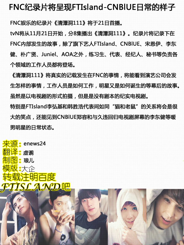 tvN将从11月21日开始,分8集播出《清潭洞111》。纪录片将记录下在FNC内部发生的故事,除了旗下艺人FTIsland、CNBlUE、宋恩伊、李东健、朴广贤、Juniel、AOA之外,练习生、代表、经纪人、秘书等负责各个领域的工作人员都将登场。