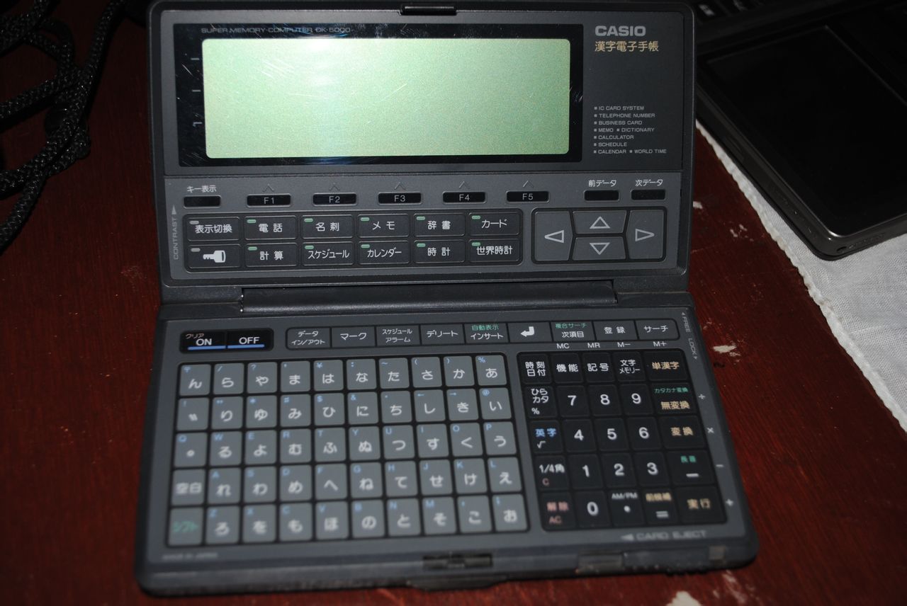 这也是电子手帐 这个比上面那个好一些 这个是液晶触屏的 中间黑色的小棍儿时电子笔 这是日本八十年代的产物 那时候中国才开始有大哥大