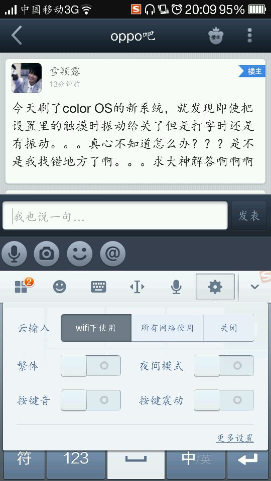今天刷了color OS的新系统,就发现即使把设置里的触摸时振动给关了但是打字时还是有振动。。。真心不知道怎么办???是不是我找错地方了啊。。。求大神解答啊啊啊