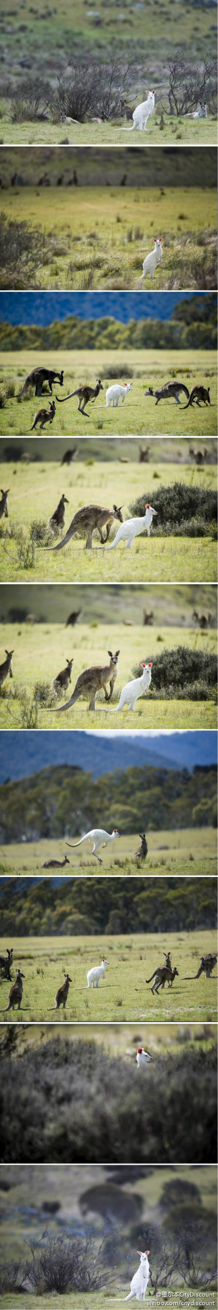 近日有人在堪培拉国家公园发现了罕见的野生白化袋鼠,并且已经2岁了,但这已算是“长寿”了,一般袋鼠的寿命有十年,白袋鼠的寿命相对短一些。因为白袋鼠的毛色太过突出,不易躲藏,容易被掠食动物发现,而且他们容易被晒伤, 患皮肤癌的几率也较高,听力和视力也不太好