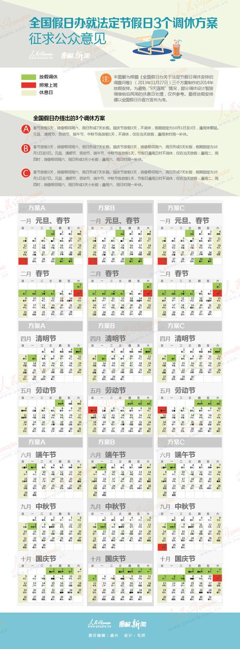 方案三:春节放假3天,调借相邻周六、周日形成7天长假。国庆节放假3天,调借相邻周六、周日形成7天长假,假期固定为10月1日至7日。元旦、清明节、劳动节、端午节、中秋节各放假1天,节假日逢周三时不调休,仅在当天放假;逢周二、周四时,调借相邻周六、周日形成3天小长假;逢周六、周日时周一补休。