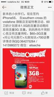 新来的小伙伴们。现在签约iPhone5S, note3 等等。在southern cross 的vodafone 旗舰店圣诞特惠活动,60刀的计划原本1.5G的流量活动期间双倍流量3G 流量。妈妈再也不用担心我没有流量用啦。$60=3G流量+同公司无限打+无限短讯+700话费 详情咨询QQ: 1413980272 微信:eliseche 电话:0434308121