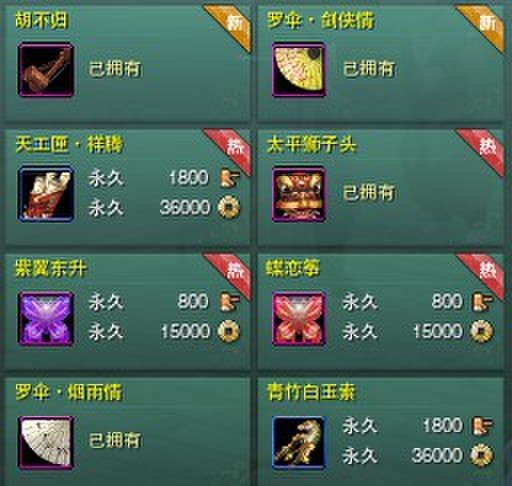 背部挂件:西山宝库•罗曼琴、天字•极乐帽、天字•霓裳架、童梦、罗伞•蝶恋花、胡不归、忆红颜、剑归、醉江湖、端、午、天字•歃血盾、蚩尤蓑、心猿意马、小邪子的福娃娃、捍天下•忠魂、冷月伞、罗伞•烟雨情、罗伞•空谷幽兰、罗伞•剑侠情、紫翼东升、汉服娃娃•听雨、诉情、青竹白玉索(因为楼主是抓马的,所以恨下心买了这个套马杆子)这次充值的挂件