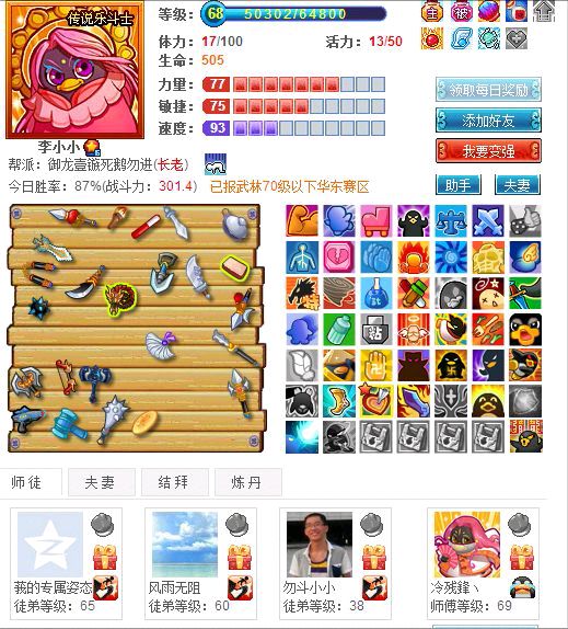 帮修13 13 7 10 14,武器全3,分享800+,技能佛山和暴雨4,战斗力222.9,50的扫地,小宝43的悟性9