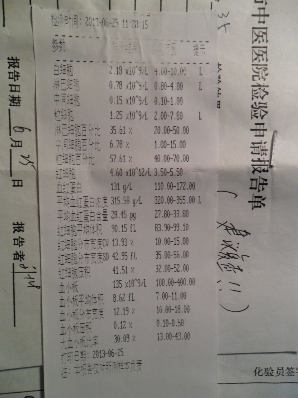 回复 新手桂花痴 :是我的化验单。一般来说如果一个人的白细胞低,他(她)的体质及抵抗能力是比较差的。