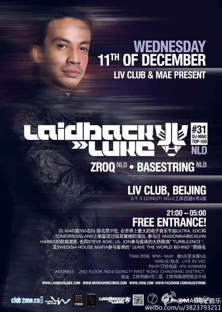 12月11日晚9点,就在工体西路六号2层LIV!我们邀请到了DJ mag排名31的Laidback Luke作为当晚的表演嘉宾!除了免票,你还可以:1、一睹Release Girls的风采!2、10张Release电子音乐派对的门票将在现场发放!