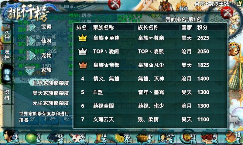 皇族灬至尊百人实力家族进驻12.13号新区星火燎原,依然霸占世界第一家族,各种开服礼包,充值vip有酒礼包已备好,欢迎大家开聊攻略,找妹纸。家族分群号115736023,国家:昊天