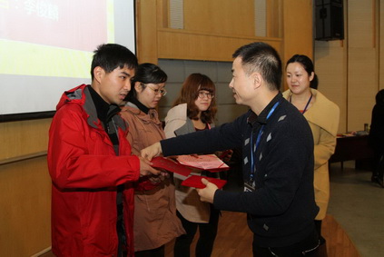 图为:学尔森上海学校杨浦分校2013建造师全科排名前三位的学员考生接受表彰