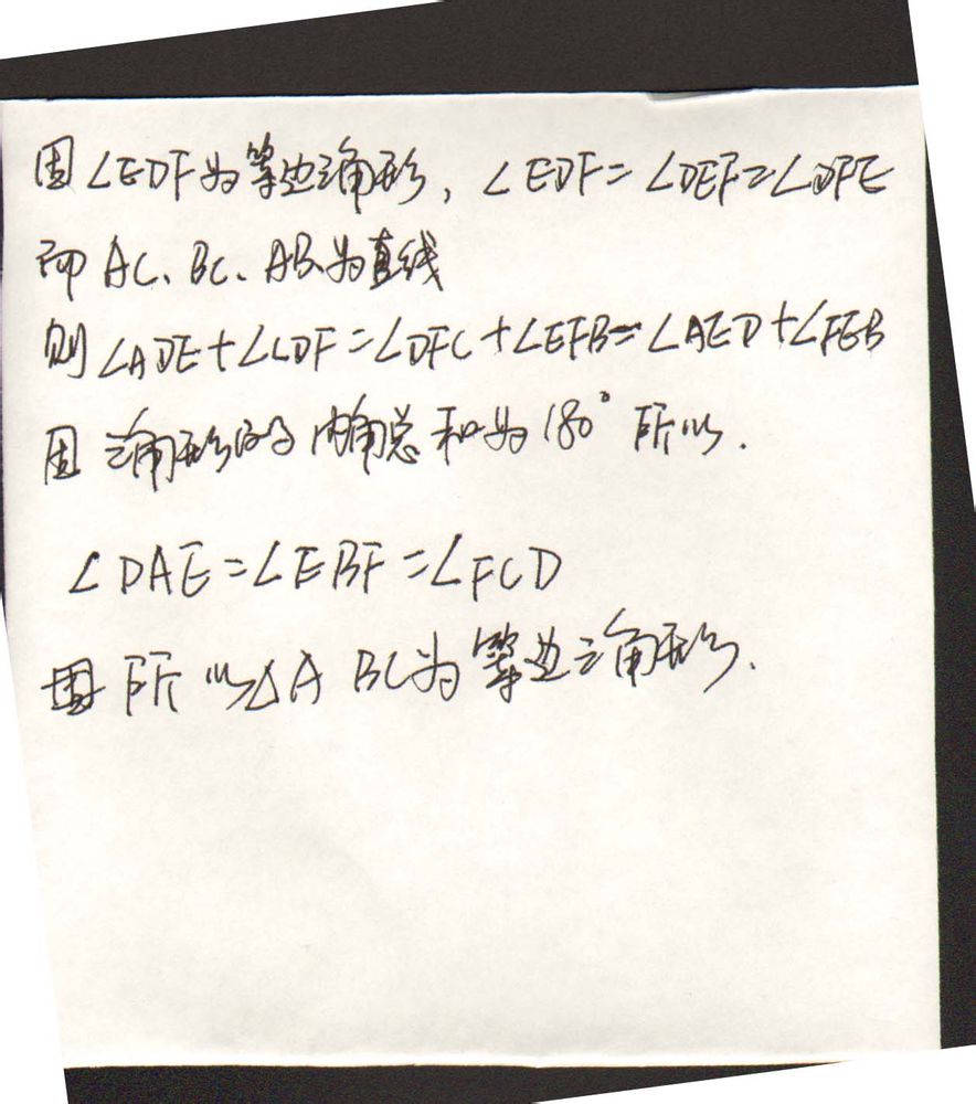 回复 83701991 :为什么不是必然的?由假设推出的三个结论互相矛盾,角BEF>CFD>ADE,角AED>CDF>EFB,然后里面小三角形等边,所以BEF+AED=CFD+CDF=EFB+ADE。