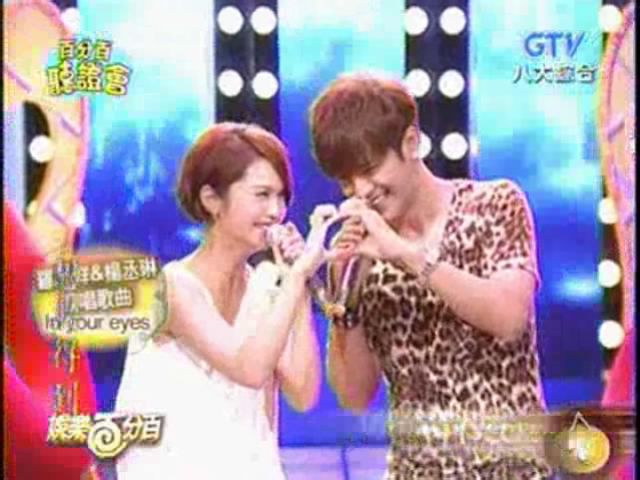 演唱《IN YOUR EYES》时候的互动更是不用说了!说明一下:第二张和第四张图多少还是有区别的,一个是没唱歌之前,一个是到了“其实你已悄悄变成我的最爱”那里,我感觉这句最适合他们两个了,所以放上来了!还有最后那个,本来两人要用手比一个心,结果罗志祥出左手,丞琳也出左手,结果勉强养成一个心,后来两人反应过来哈哈大笑,最后组成一个完整的心!向征着两人会有个完美的结局!