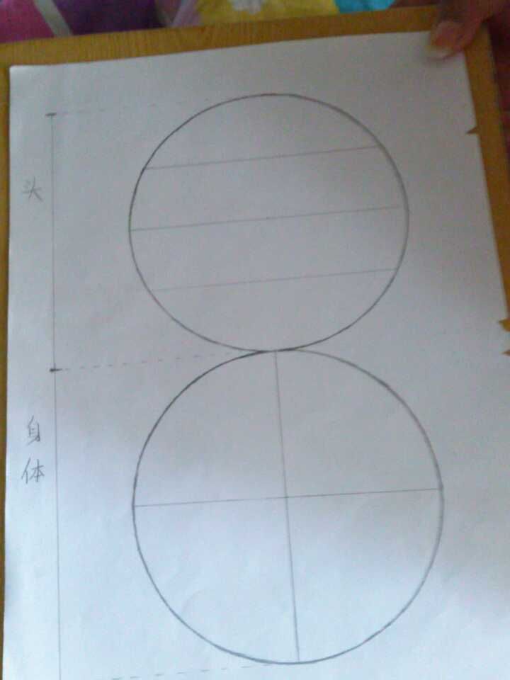 画两个圆,一个是头,一个是身体的总长。头:过圆心画一条线,再在上下各画一条,把圆大致的分为平均的四份;身体:过圆心画一个“十”字