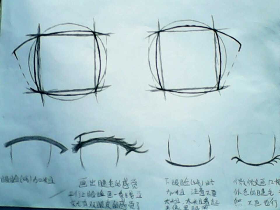 3:加粗上眼睑(线),画出睫毛的感觉,在平行上眼睑的位置画一条线,这样,就有双眼皮了,略加粗下眼睑,注意:不要加太粗,不然看着像黑眼圈,画几根外弯的睫毛,不画也行凭个人喜好。