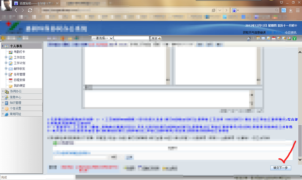 首先是渣渣IE,已添加兼容视图,然后新建一个流程,按理来说,右下角也就是卤煮红线划出来的地方应该有个“转交下一步”按钮的,但是直接木有了,这要叫人怎么接下去办理