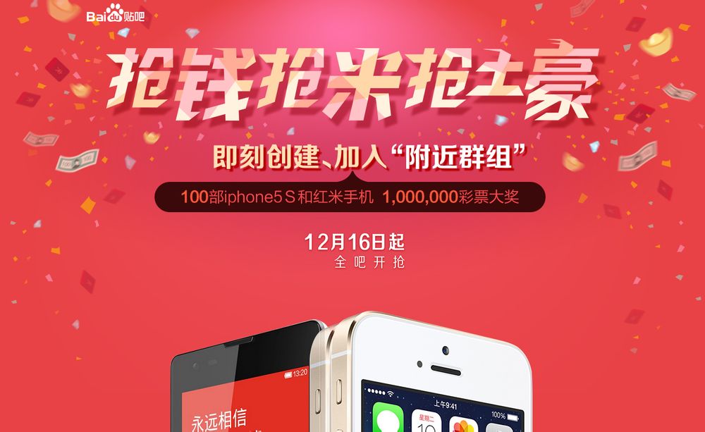 现在开始在最新版本贴吧客户端创建、加入“附近群组”,创建、加入的“附近群组”越多,越有机会“刮”出百万豪礼,从12月16日开始就让我们一起来抢钱、抢米、抢土豪![[haha]](/static/emoticons/haha.png)