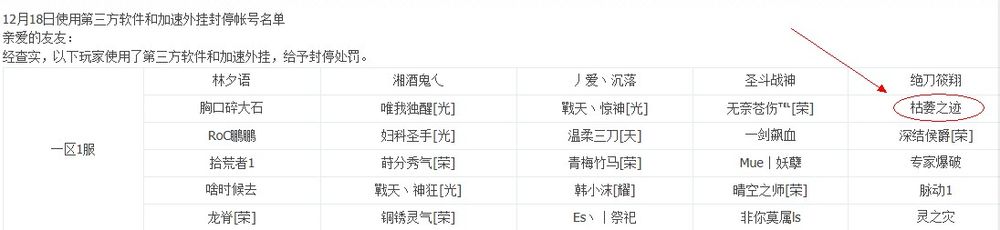 一区一服使用外挂封号名单,好几个都是枯萎大神会的,还有他小号