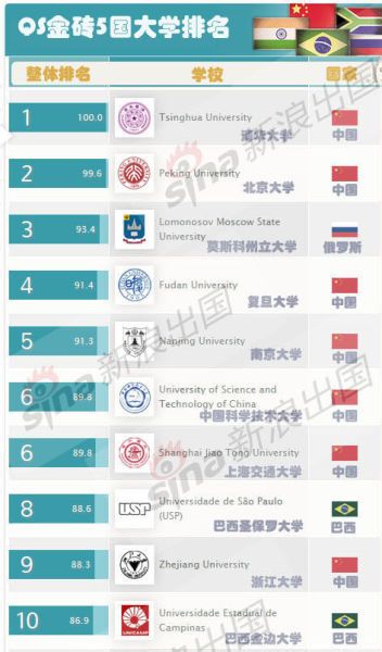 负责调查世界最佳大学排行榜的QS公司,汇整了金砖5国的大学排行榜,这是全球第一份采用专门方法评比的大学排行榜,针对拥有相同特性的国家,以较公平的立足点进行排名。