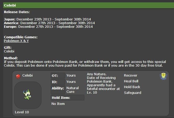 上边是雪拉比网的消息,12月25号(欧美版则是27号)至9月30号,只要你在口袋妖怪存或者取过口袋妖怪,即可得到这只雪拉比。雪拉比的原始主人跟ID号都是自己的!(对于对自己ID有强迫症的楼主来说真是好消息!)特性是自然恢复,性格随机且不携带物品。技能是自我再生,治愈之铃,新技能保留(第二张图上说效果类似刀背打)以及神秘守护。