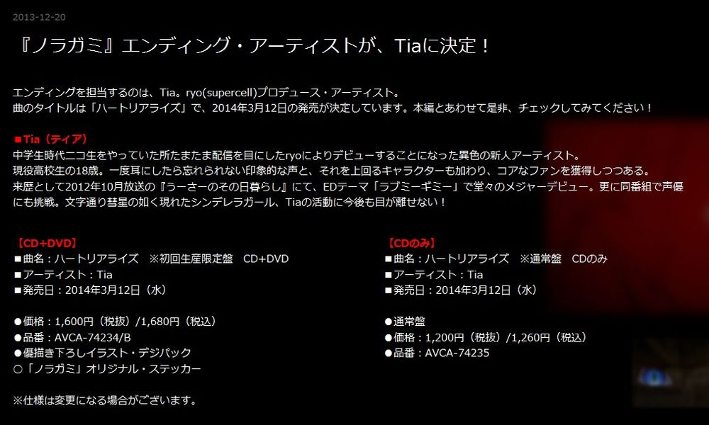 一月新番野良神「ノラガミ」的ED确定由Tia演唱,曲名「ハートリアライズ」,supercell的ryo制作,单曲将于2014年3月12日发售。
