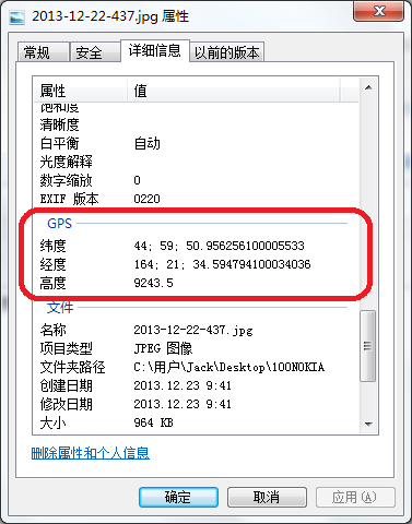 我用的是Windows自带的属性窗口。。。可以看出来经纬度是以时、分、秒的方式表示的,海拔的单位应该是米。另外单反似乎是要另外购买GPS模块的,那玩意不便宜。