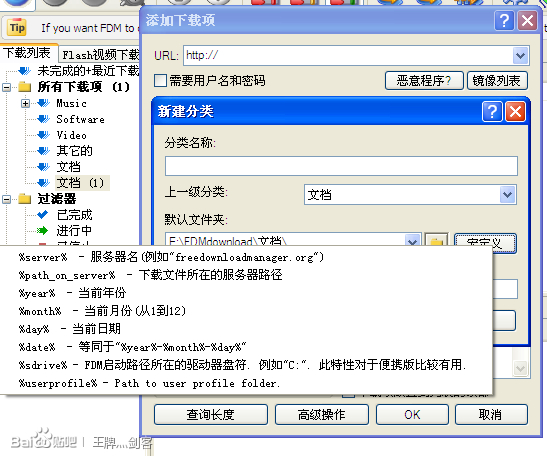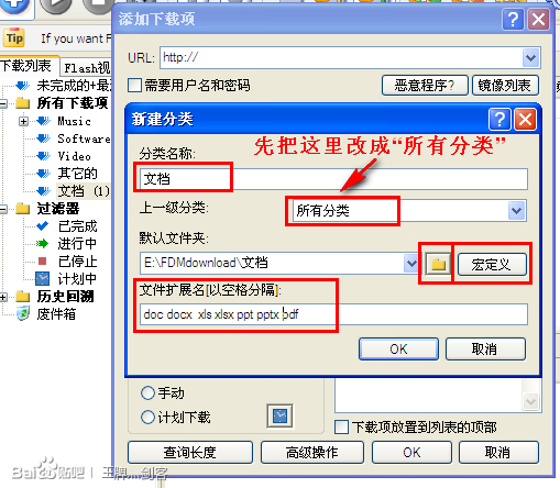 FDM的默认分类只有“music,software,video,其他”这几个。若还想加其他的,点击新建分类的按钮,然后照下图所示