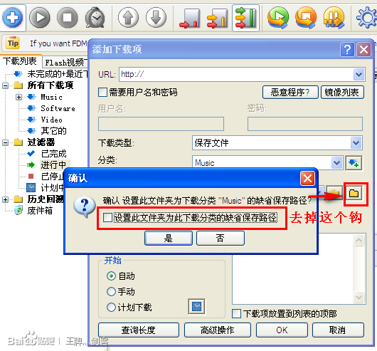 去掉“设置此文件夹为此下载分类的缺省保存路径”的钩【切记】。然后该文件夹就是"music"的默认保存路径了,音频文件就会保存到这个文件夹中。
