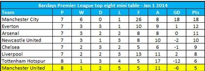 名英超积分榜前8名的球队分别是阿森纳、曼城、切尔西、利物浦、埃弗顿、热刺、曼联和纽卡。而在8支球队的相互对抗中,曼联成为了人尽可欺的“软柿子”。