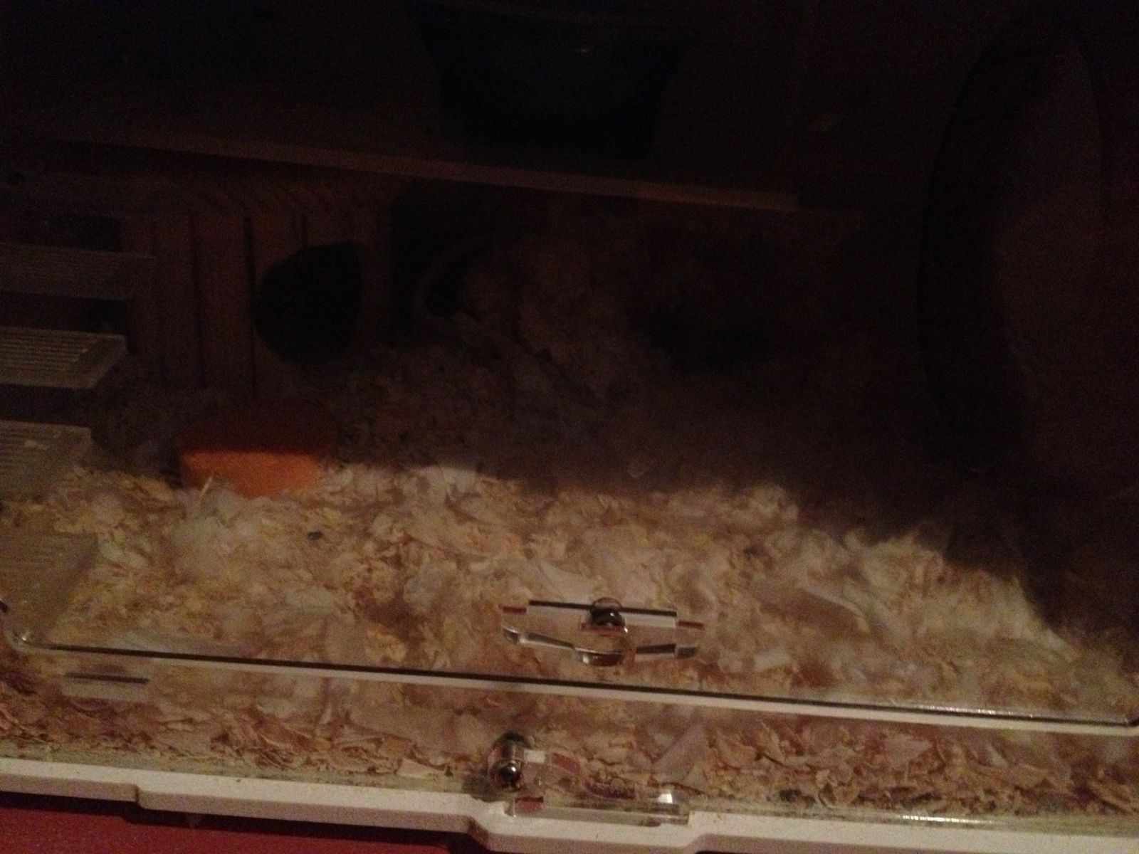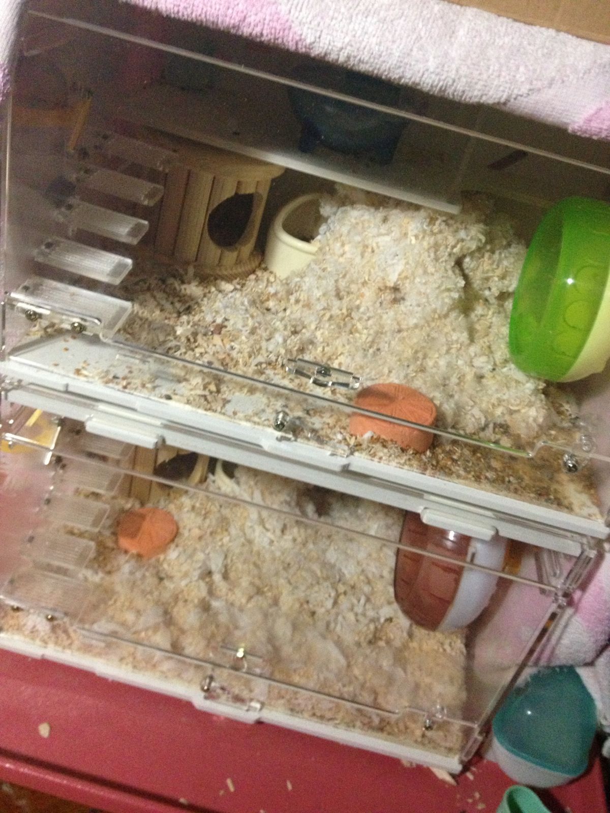 目前用水瓶灌了热水放窝里 之前把它放在上面 似乎嫌热 爬了下去睡在木屑上面 刚把它放在浴室里 里面放了棉花 靠在水瓶旁边