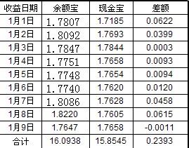 14年1月份现金宝与余额宝收益对比做了个表,大家可以看下,