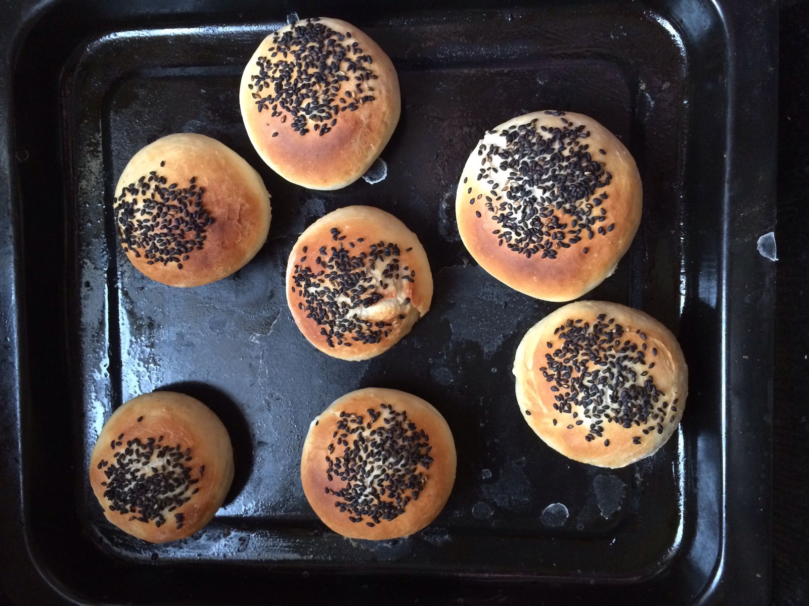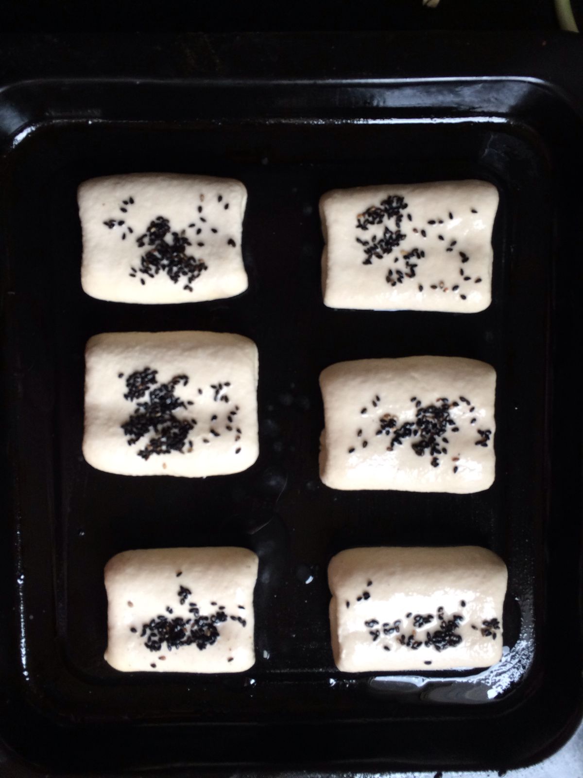 想要圆的就像揉馒头一样揉圆再压扁就成。烧饼生胚做好,烤盘地下刷油,把生胚码放好。再取一个碗放小半勺盐,拿水稀释后刷到烧饼生胚上,再粘上芝麻。私以为白芝麻会更好看些吧。。。无奈家里只要黑芝麻了