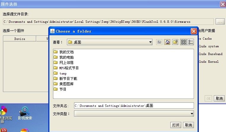 先前不是还下载了一个强刷固件放在桌面上吗,照图片作,在查看里选上桌面,点击打开。