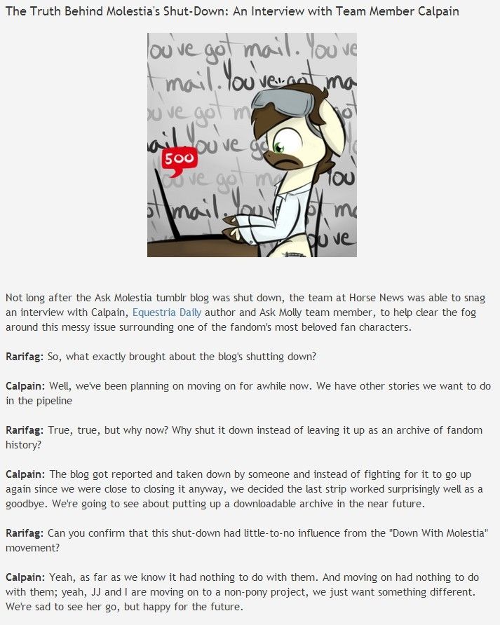 抱歉之前的消息有误,且未经查证就仓促发布了..以下是正确信息(由子之半提供):媒体采访了作者跟孩之宝,经过确定,博客关闭并非之前的被递律师函.而是M公主的博客遭到了大量恶意举报导致关闭.另外..好消息:作者表示很感谢FANS的支持,会继续在游戏公主露娜的新页面上更新一些内容,不过因为时间原因不会更新的太勤.欢呼吧,Bronies!