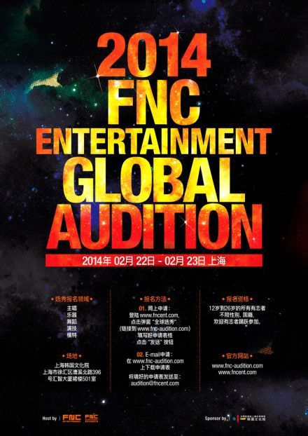 FNC Ent的首次全球选秀将于2014年2月22日到23日在上海举行。.进行网上报名/ 也可用e-mail发送报名表格来申请,请大家多多支持。