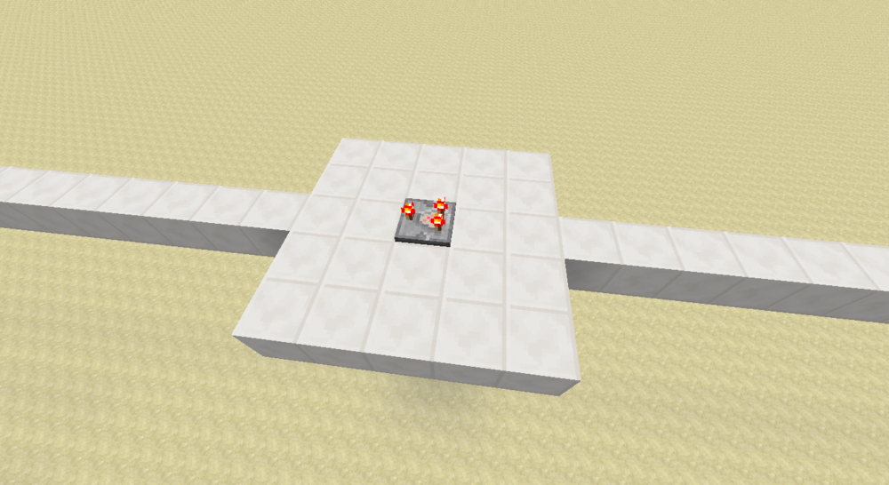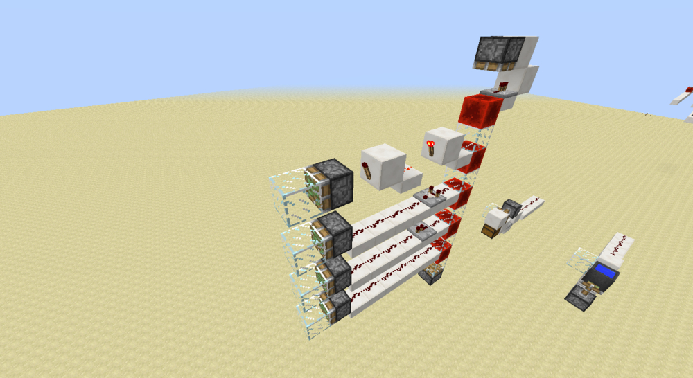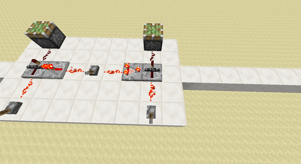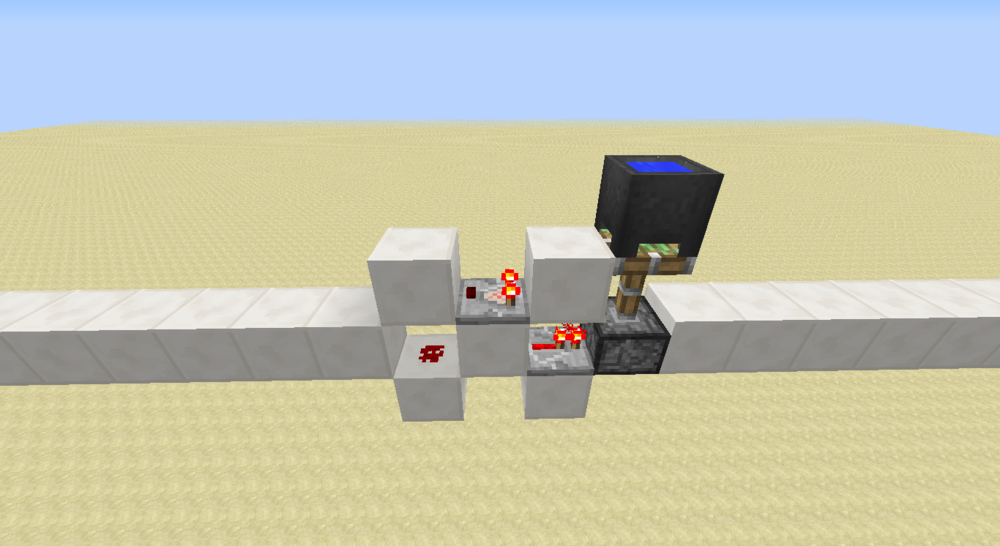 如果你用过这个电路,你应该知道上图的单元是没法直接放到电路里的。。。如果需要通用性比较好的红石导线作为输入和输出,需要下图的结构。由于是模电,所以这里拉杆位置原本阻断的两路信号即使串起来也没事。