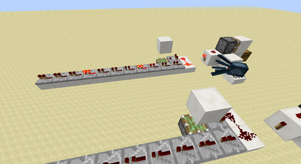 可以看到处于锁存状态的中继器会出现奇怪的结构。。。根据输入和输出的情况来看,中继器也的确处于锁存状态。可是右边的电路呢OAO 为何根据输入输出同样应该处于锁存状态的中继器却显示正常?难道也是BUD么OAO