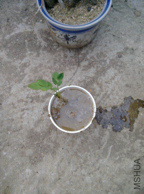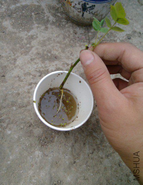 品种为亚伯,才一条根。图中为示范,水比较少。2、把大颗粒的园土放底部,然后把枝条放到合适位置(确保根系在水中),慢慢放入粉状素园土。