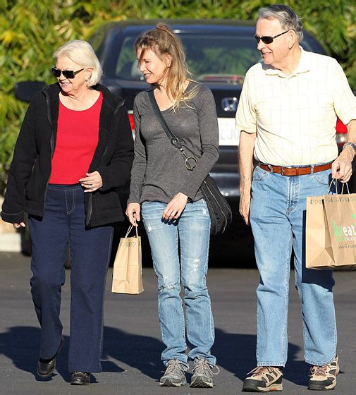 蕾妮·齐薇格和她的父母埃米尔和Kjellfrid - 都穿着蓝色牛仔裤 - 享受午餐在Kreation咖啡馆在圣莫尼卡,加利福尼亚州,12月26日。