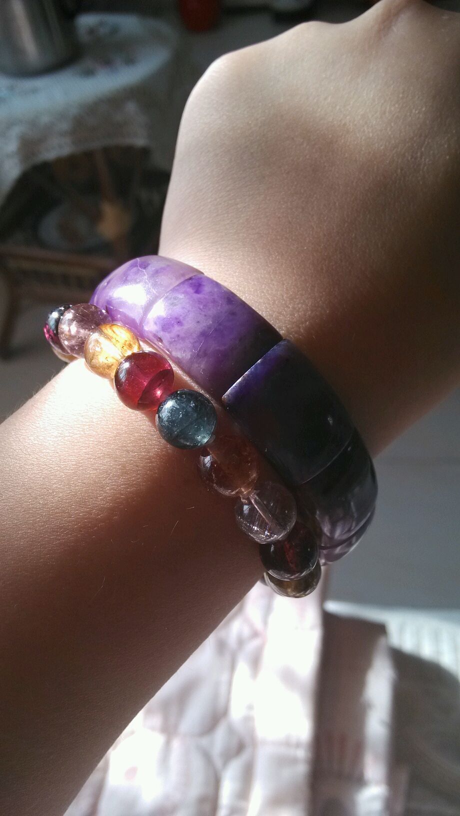 回复 晶瑩糖糖 :之前都是左手戴大珠晶宝戴银镯的。。例如15.5mm海蓝宝+15mm蓝晶石+100克重银镯。。我倒是不觉得重吖神马滴。。但是麻麻说不美观。。