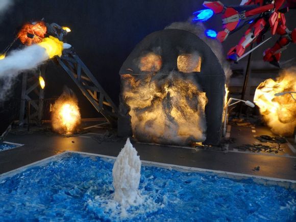 爆炸的火焰是棉花团做的,很不解导弹尾部气体是怎么做出来的,白色的塑料棒弄弯之后裹上棉絮?