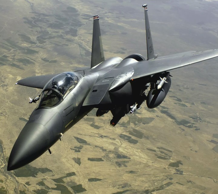 F15 E攻击鹰机腹下挂载光电吊舱,左右携带激光指导炸弹,AIM 120空空导弹和副油箱