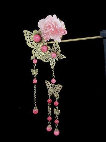 步摇:是在顶部挂珠玉垂饰的簪或钗,是古代妇女插于鬓发之侧以作装饰之物,同时也有固定发髻的作用。一般形式为凤凰、蝴蝶、带有翅膀类的,或垂有旒苏或坠子,走路的时候,金饰会随走路的摆动而动,栩栩如生。取其行步则动摇,故名。