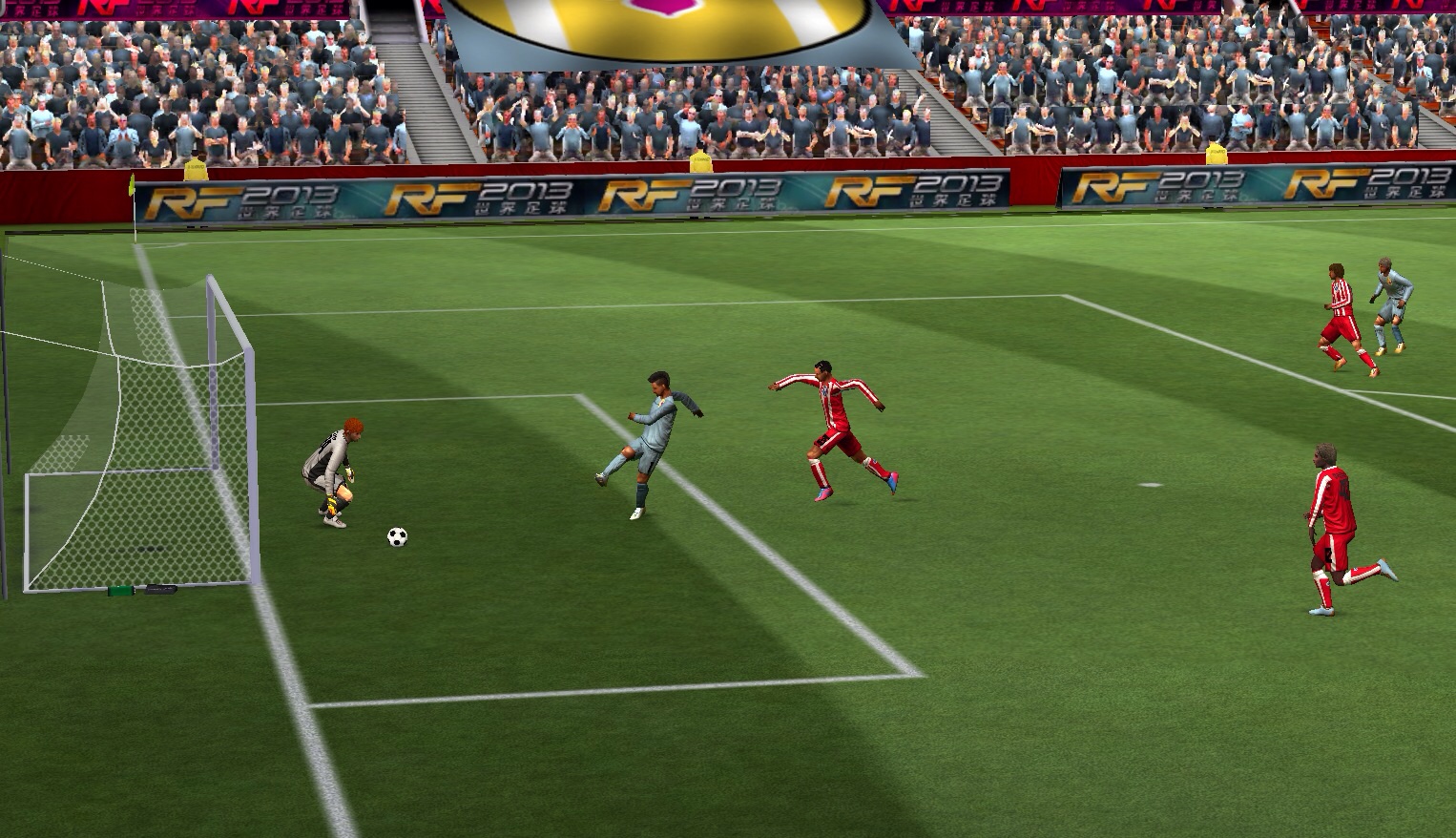 2)按射门键,顺时针下向滑动半圆(从右向左攻),手指停留约0.5-0.8秒。
