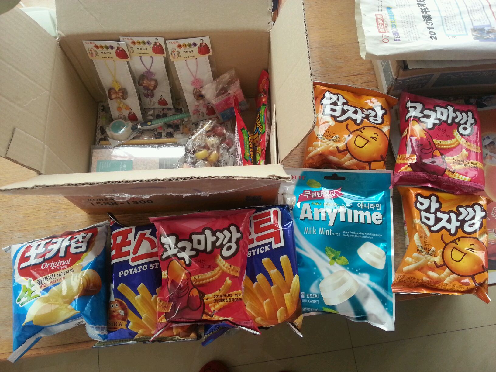 满满的开心,韩国的零食和糖糖,还有韩国当地的贴纸文具书签本本,超级赞!