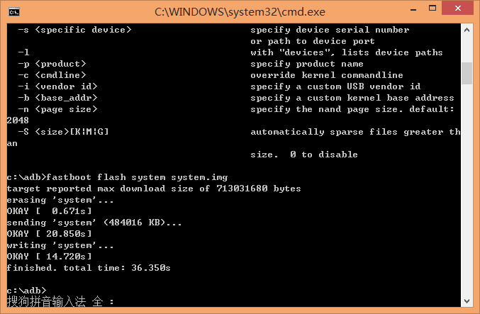 输入fastboot flash system system.img回车,这里是刷入system分区数据,要稍等一会