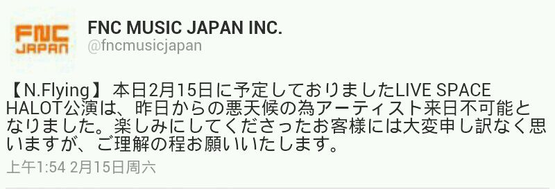 翻译:【n . flying】今天2月15日确定了halot space live演出,从昨天开始,因恶劣天气的艺人来日本看了。期待的顾客非常抱歉,你的理解吧。